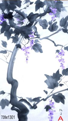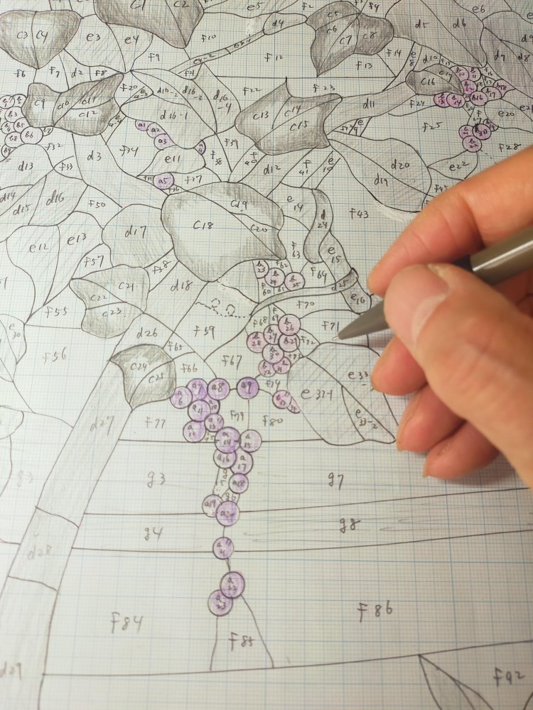 同時に紫のブドウの実もカットしています。青紫(ヴァイオレット)と赤紫(パープル)の2色で、ランバーツ社とフィッシャー社のアンティークガラスです。フィッシャーも今はない会社です。