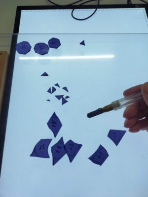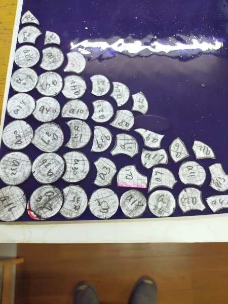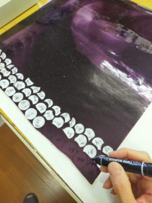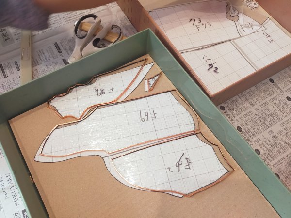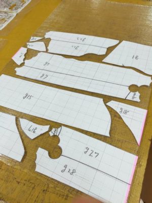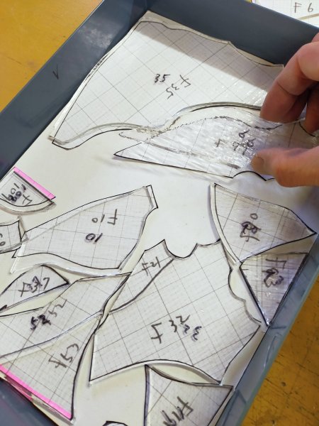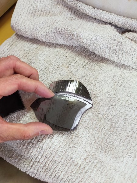 ガラスカットも後半に入っています。背景ガラスはクリアなのですが、2種類使っています。今カットしているのはフィブロイドガラスと言ってヘアラインの凹凸模様が入っています。今はなきウロボロス社の名品で、当工房のストックもあとわずかです。