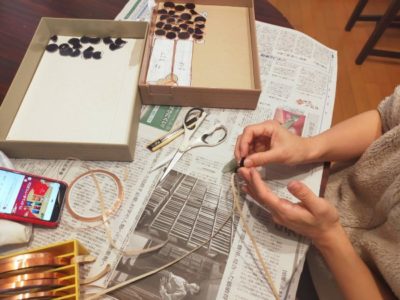 研磨が終わったガラスピースには、切断面を包むように銅テープ(コパーテープ)を貼り付けていきます。ぐるりと1周巻くわけです。組み立て時にこの銅部分にのみハンダが付きます。
