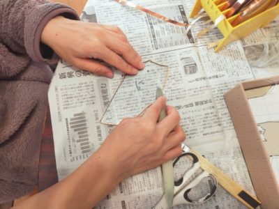 この銅テープ巻は、そのまま仕上がりに影響するので、ガラスカット以上に慎重に作業します。反対にガラス切断面は、最終的にはハンダの奥に隠れて見えないので、気合を入れてきれいにする必要はありません。