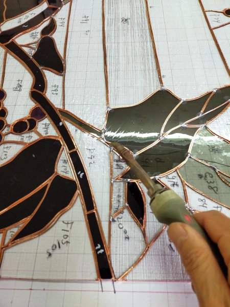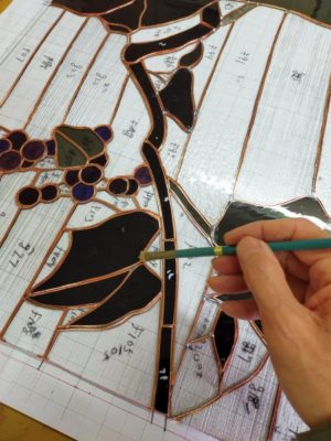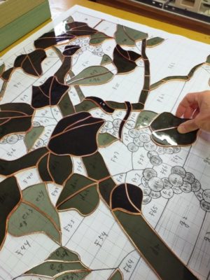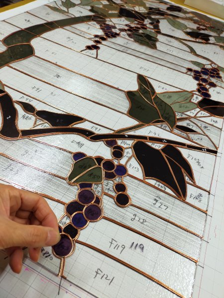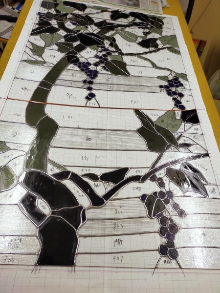 縦1.3mの大判ステンドグラス「山ぶどう」は、銅テープが巻き終わり、組み立て作業に入っています。台紙の上にガラスピースを載せていくと、絵の全容が初めて見えてきます。