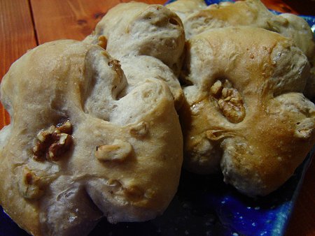 お花のように形作った胡桃パンです。2次発酵時に丸く成形後、はさみで3箇所切り込みました。なるべく深く大胆に切り込みをしないと生地が膨れて跡形もなくなってしまいます。どうぞ、切り込みは大胆に。