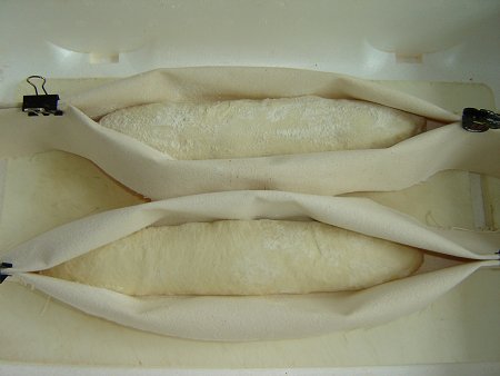 形が崩れないように、パン作業に使用するキャンバス生地にパン生地を置きます。形を維持する為です。形を維持しないまま2次発酵すると、生地がベトーっと垂れて大きくなり、見た目が悪くなります。