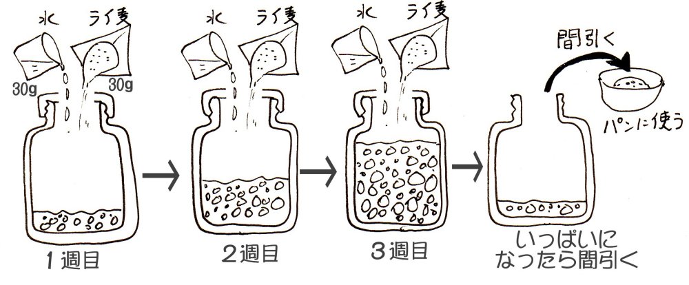 ① 1週間に1回程度、餌(ライ麦30gと水30g)を追加し、良く混ぜる。