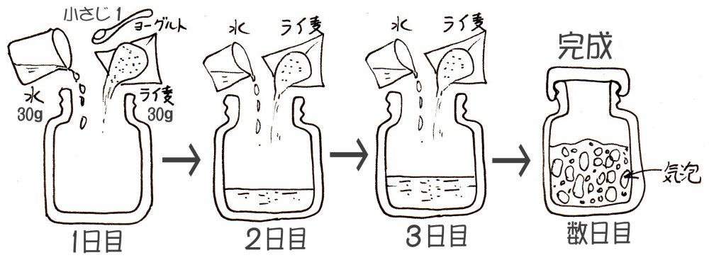 ① 餌(ライ麦全粒粉30gと水30g)を練り、(手に入れば)活きたヨーグルト小さじ1杯を混ぜ、ビンに入れ室温にて保存。