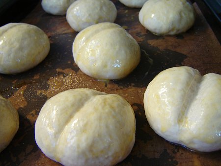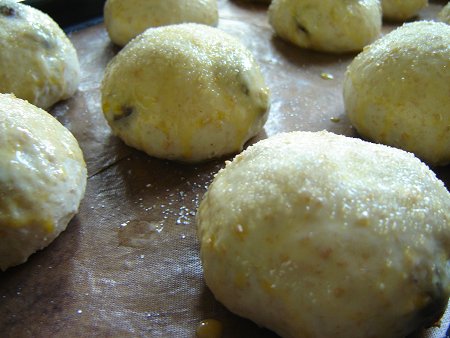 上部にグラニュー糖をまぶして焼きました。ほんのり甘くてふんわり優しいパンです。