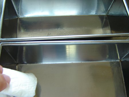 ⑩この作業を2回繰り返して、容器には全分量の味噌が入りました。上面をシャモジで平らにならして、空気が入らないようにラップで覆います。このとき、容器上部に付着した味噌はアルコールをつけたティッシュでよくふき取っておきます。でないと、後日、容器の内側がカビだらけになってしまいます。