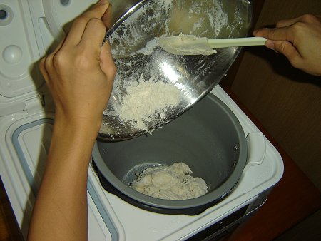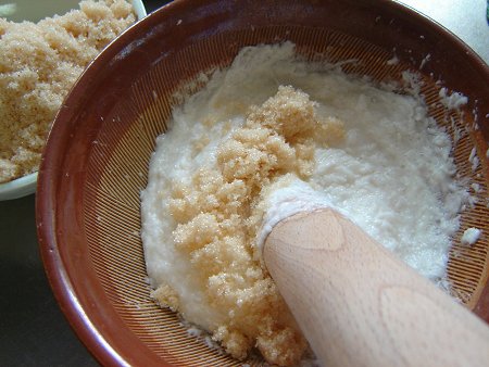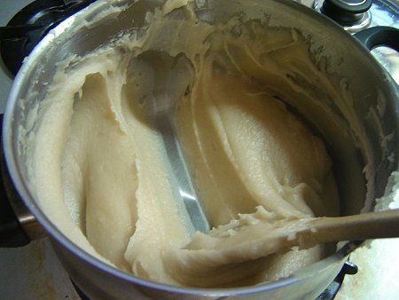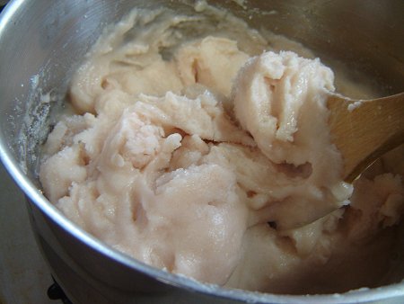 ⑤一方豆は、荒熱をとって乾燥換算1kg分を一度にもちつき機で捏(こ)ねました。捏ね方や時間は、取り扱い説明書にそって行っています。使用しているもちつき機では、「こねる」というボタンをおすと捏ねてくれます。30秒捏ねてはシャモジで混ぜなおしと、数回繰り返します。大豆がペースト状に潰れたら終了です。