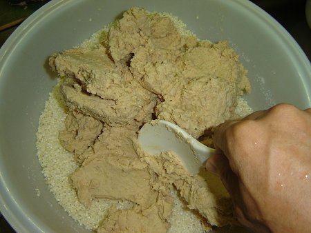 ⑥捏ねた豆(乾燥換算)1kgが35℃に冷めたら、先程の塩きり麹と混ぜ合わせます。