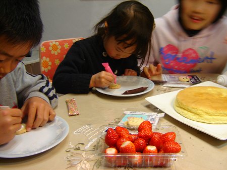 この日は私がスフレチーズケーキを焼き、デコレーションは子供達に任せました。