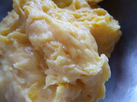 二回目の加熱後の状態。再度、ラップをして500wで2分加熱。良く混ぜたら、餡子を包みます。