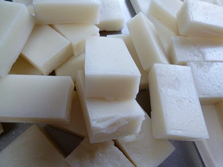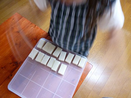 前日にお餅を作り、翌日、表面が乾いてから袋に入れて冷凍庫へ。この作業、積み木遊びをしている時間は朝の5時。