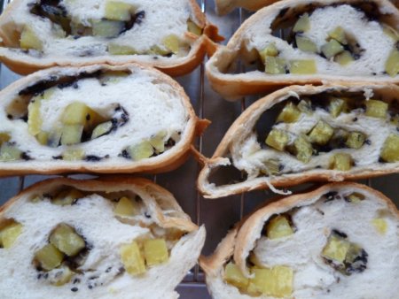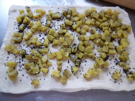 サツマイモパン 投稿日時: 2012年9月10日 投稿者: yuki lapin JUGEMテーマ:手作りパン 美味しいサツマイモが収穫できたので、サツマイモパンを作りました。 サツマイモはサイコロ状に切り、水、砂糖、塩で柔らかく煮ます。 1次発酵済みのバターロール生地を薄く伸ばし、そこに甘く煮たサツマイモと胡麻をまんべんなく乗せます。 クルクル巻いて型に入れ焼成。私は、円筒状の型に入れて焼きました。 サツマイモの重みで、円にはならず無念・・ 形はどうあれ味は抜群。美味しくできました。 にほんブログ村良ければクリックお願いします。