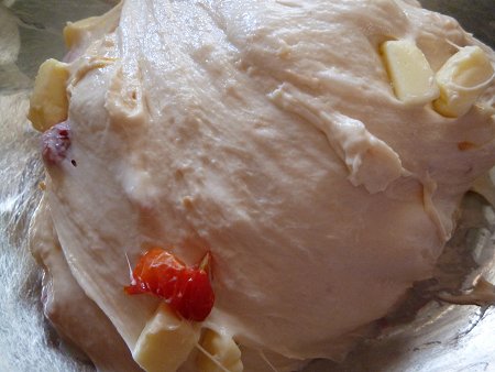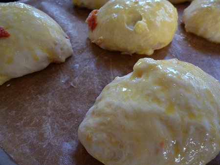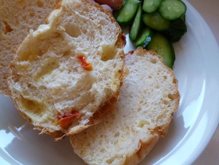 ドライトマトのパン 投稿日時: 2012年9月11日 投稿者: yuki lapin JUGEMテーマ:手作りパン 以前、作って冷凍してあるドライトマト。今回はパンに入れて焼いてみました。 ドライトマトは半分に切り、サイコロ状にしたチーズと一緒にパン生地に練りこみます。 機械で捏ねた為、程よくトマトが潰れていい感じ。綺麗なピンク色になっています。 2次発酵後。溶き卵を塗って、いざオーブンヘ。 さて・・味はどうだろう?? トマトが少なすぎたな・・と反省。味、しこしこした歯ざわりは抜群でした。 <ドライトマトのパン> 強力粉 350g インスタントドライイースト 6g 砂糖 20g 塩 7g バター 20g 水 250g ドライトマトとチーズはお好みです。 〇生地分量を混ぜて捏ね、途中でドライトマトとチーズを混ぜ込む。 〇1次発酵 2~3倍に大きくなるまで。 〇ベンチ無しで成形。 〇2次発酵 2~3倍に大きくなるまで。 〇250度で予熱。230度に下げて25分焼成。 にほんブログ村良ければクリックお願いします。