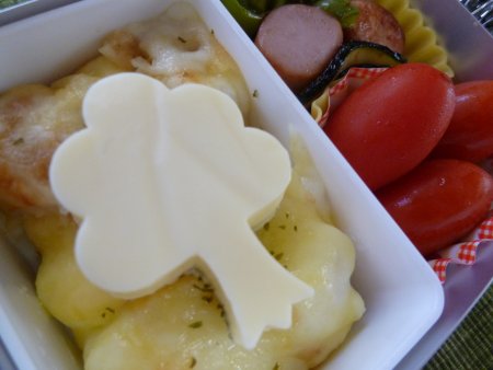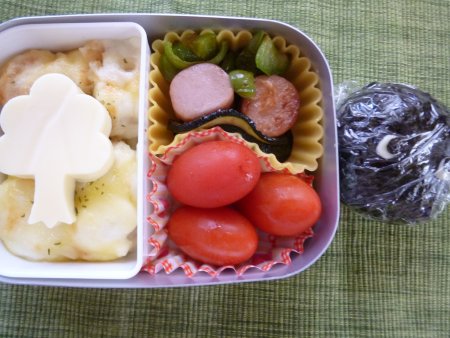 今日の長女のお弁当 投稿日時: 2012年9月24日 投稿者: yuki lapin JUGEMテーマ:食生活 今日のお弁当は・・ まっくろくろすけ弁当。 〇まっくろくろすけおにぎり 〇ピーマンとズッキーニとソーセージの炒め物 〇ミニトマト 〇ポテトグラタンのチーズのせ 〇桃(別の容器) となりのトトロをご存知の方は、お分かりでしょう。このチーズの木は、くすのきです。映画に出てきますよね。 こんなんで、いいのかなぁ・・と思いますが、一応まっくろくろすけです。 今日は、完食できるかな? にほんブログ村良ければクリックお願いします。