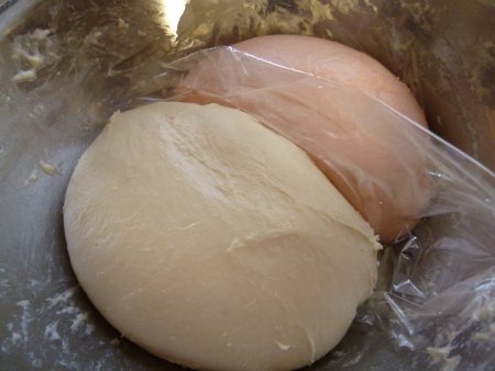 ※捏ねた後、生地を2分割にし、ほんの少しの食紅(米粒程度の大きさ)をほんの少しの水で溶かし、ひとつの生地に混ぜて捏ねます。