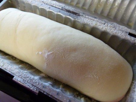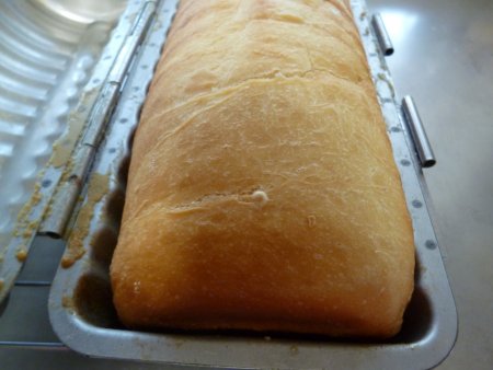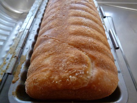 今回の反省点は、2次発酵の終了の目安。よく見ると生地が6分目くらいしか発酵していないので、次回は、型の8分目くらいまで膨らませたほうが良いな・・