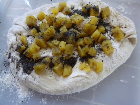 紅茶、茹でたさつまいもを潰して加えた生地を作り、さらに、甘く煮たさつまいもを中に入れてクルクルクルクル。さつまいもがたっぷり入ったパンを作りました。