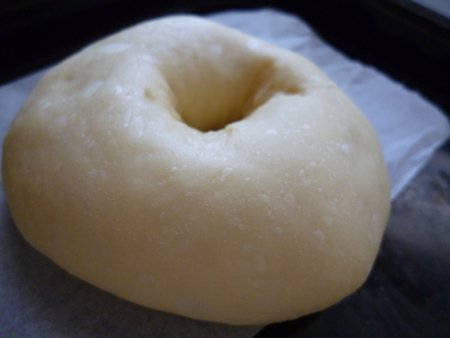 一次発酵後、成形した生地(ドーナツ状に)を、生地より一回り大きく切ったクッキングシートの上にのせ2次発酵。