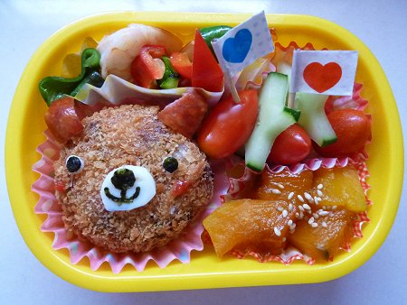 龍ケ崎市が開いた、コロッケを使った「キャラ弁コンテスト」で、僭越にも私がエントリーした「野菜畑のクマさん弁当」が最優秀賞を頂きました。