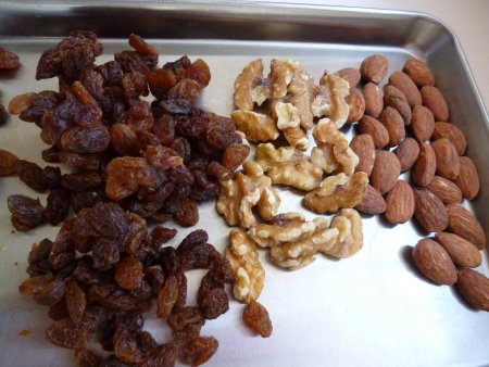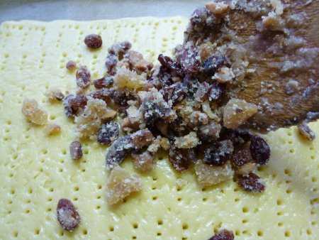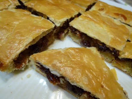 作り方を簡単に説明しますと、2枚のクッキー生地の間に、キャラメルで煮詰めた数種類のナッツやレーズンを挟んで焼く重厚なお菓子。