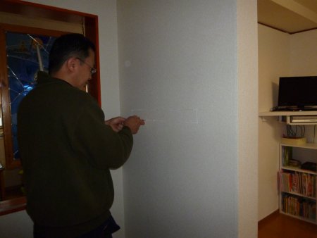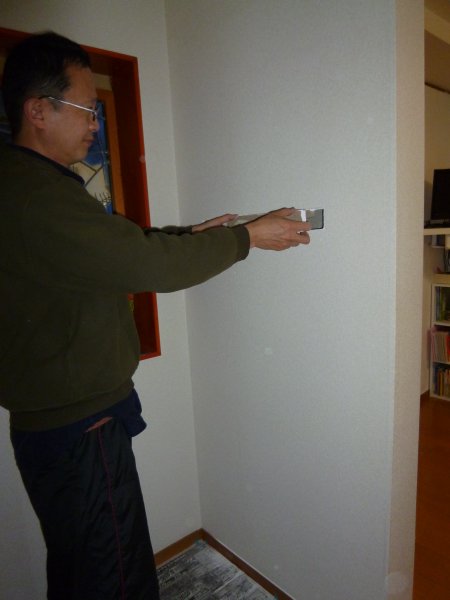 壁を取る前に、その中がどうなっているのか不明なので、専用の針をさして、探ります。もし、筋交いがあったら計画を断念しなければなりません。