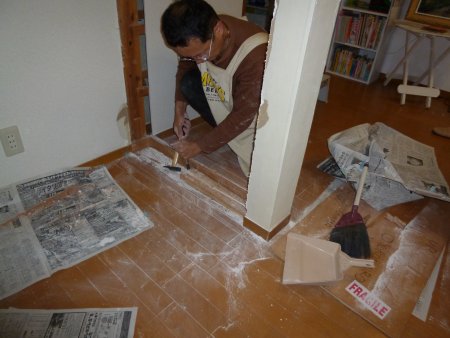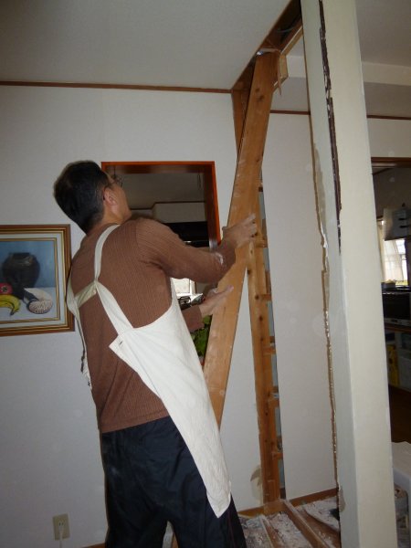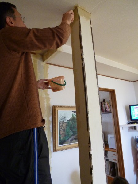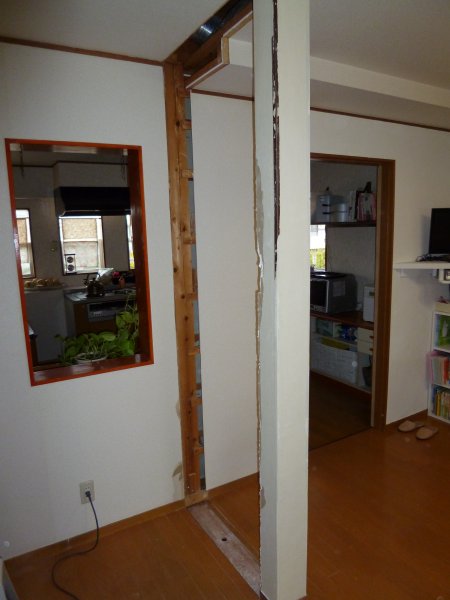 まず、2階のリビングルームです。ここには、カウンター式のシステムキッチンがあった名残で、幅90cmほどの小壁がT字型に出っ張って存在し、じゃまっけでした。これを、柱だけ残して撤去したいと思います。本当は私がやりたかったのですが、夫がさくさく始めてしまいました。