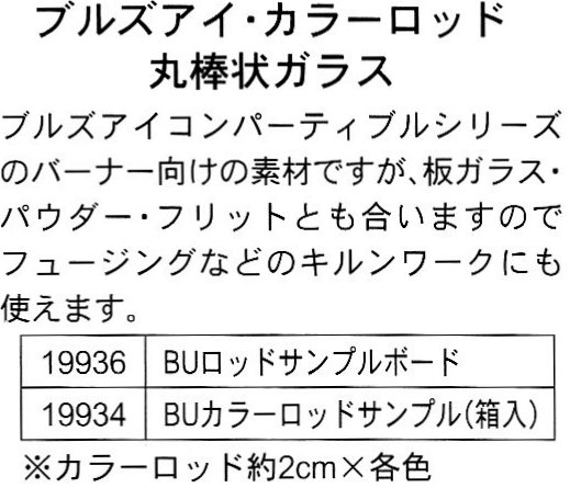 ※ブルズアイ社(BU/BUF/BUT)のガラスサンプルは、以下のようにシリーズごとに分割されています。・BJ-901 ステンドグラス用(BU)・BJ-960 フュージブル・単色オパールセント系(BUF)・BJ-961 フュージブル・単色透明系(BUF)・BJ-962 フュージブル・ストリーキー(BUF)・BJ-963 フュージブル・イリデセント(BUF)・BJ-915 フュージブル・2mm厚(BUT)・BJ-923 フュージブル・フリット・BJ-934 フュージブル・カラーロッド【お願い】ご注文前に必ずで在庫確認をしてください。